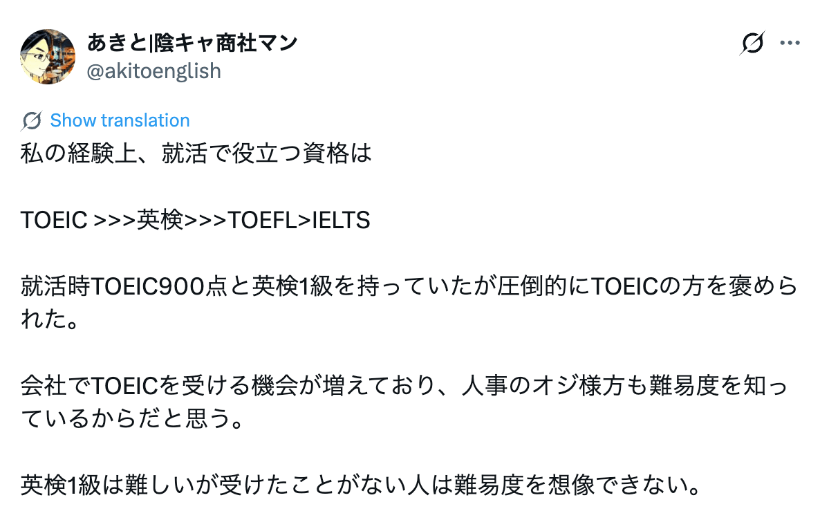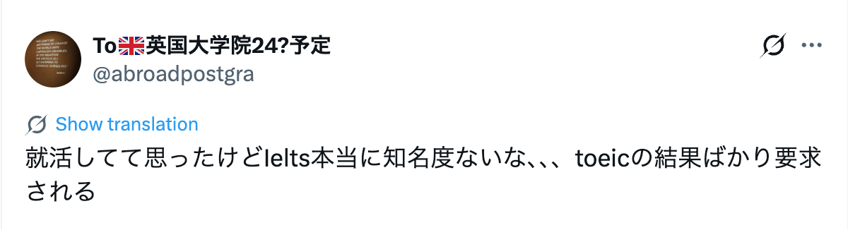 Xで「IELTS 就活」と検索すると、国内就活ではTOEICが一番使えるという声が多く見つかりました。