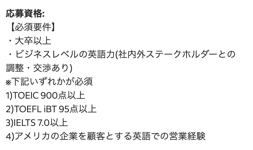 私が実際にIndeedで求人票を調べたところ、英語講師以外の求人で、英語力を条件にしている求人の多くは以下のような表記でした。