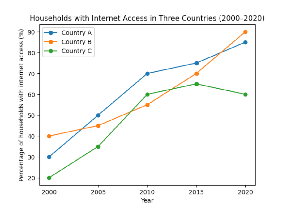 The line graph below shows the percentage of households with access to the internet in three countries (Country A, Country B, and Country C) from 2000 to 2020.